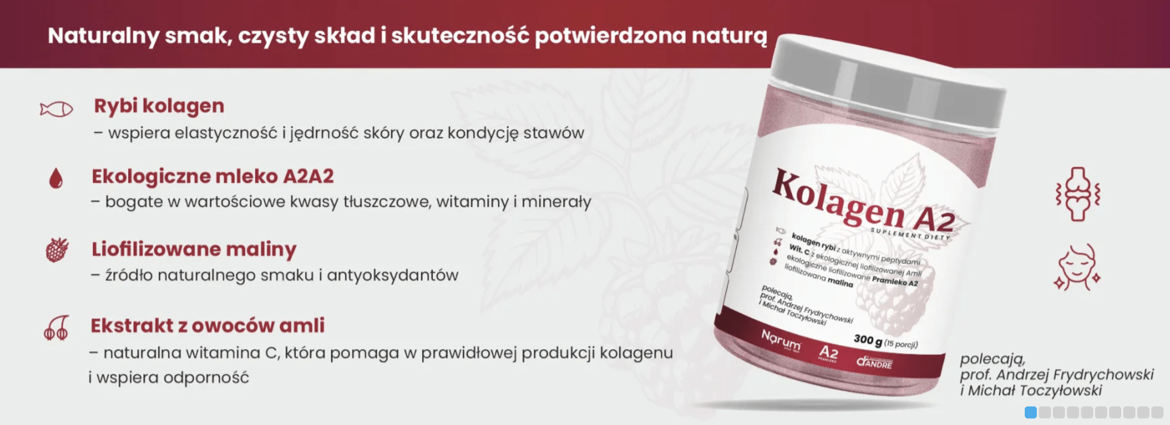 Suplement diety stworzony na bazie ekologicznego mleka i liofilizowanych owoców maliny uzupełniający dietę w rybi kolagen oraz pochodzącą z owoców amli witaminę C, która pomaga w prawidłowej produkcji kolagenu, co wspiera prawidłowe funkcjonowanie skóry, stawów i kości.